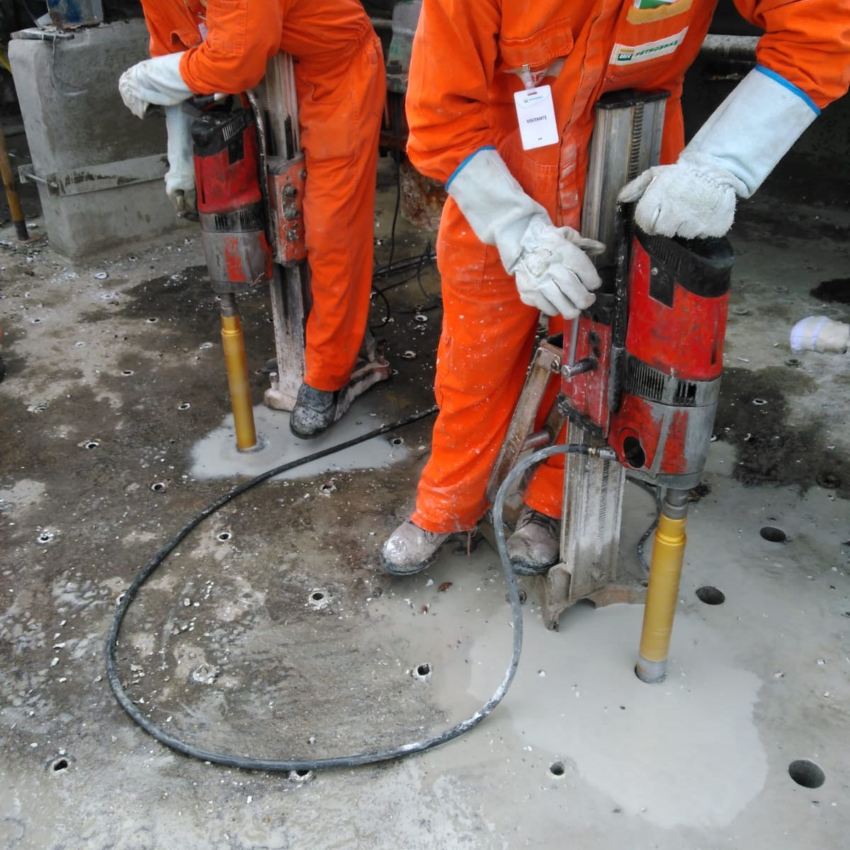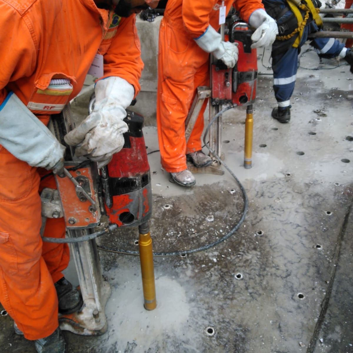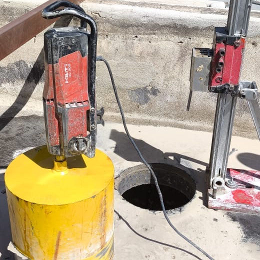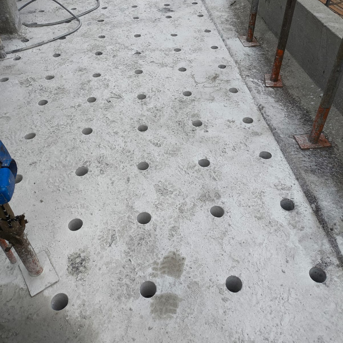 Perfurações precisas em lajes, vigas e paredes para passagem de tubulações, cabos elétricos e instalação de ar-condicionado.